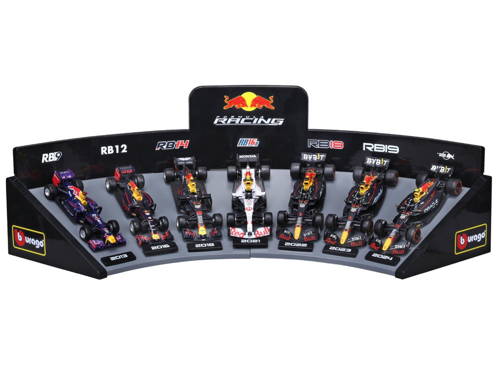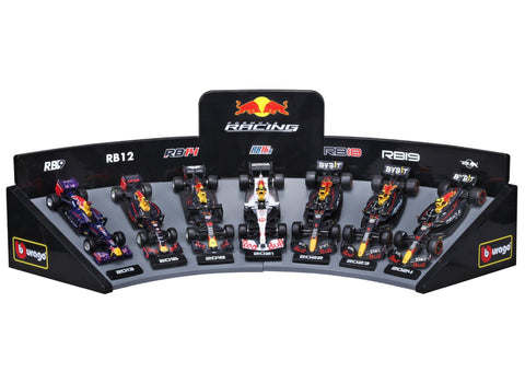 - Set Includes: 7 Red Bull Racing Formula 1 cars + 1 plastic display stand